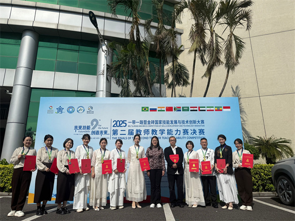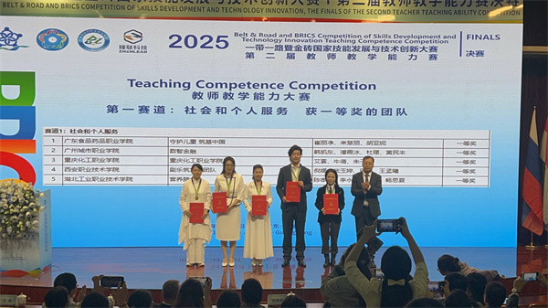 新闻网讯(通讯员 莫足琴 任真)11月14日,2025年“一带一路”暨金砖国家技能发展与技术创新大赛第二届教师教学能力比赛全国总决赛在珠海城市职业技术学院圆满落幕。我校4支参赛教师团队凭借扎实的前期准备、默契的团队配合和出色的临场发挥,在全国181支参赛队伍的激烈角逐中脱颖而出,应用文写作(祝子媛、何玲玲、刘萍萍)、家庭营养与膳食指导(陈孝强、李永端、汤琼、畅思夏)两个团队斩获一等奖;首饰创意设计与制作(任政、冷晓颖、李孟悦、林增雨)、安装工程施工(唐克静、胡立群、吴力、赵丽)两个团队获得二等奖,为学校赢得了荣誉。